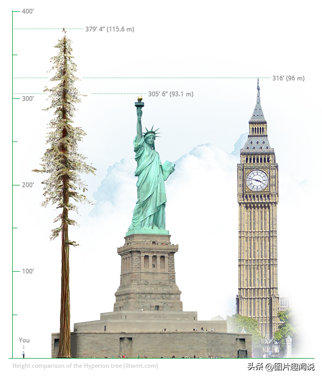 07:世界上最高的树:海波龙于2006年8月25日由博物学家克里斯·阿特金斯和迈克尔·泰勒在美国加利福尼亚州的一个非常偏远的地区发现,据信它大约有700-800年的历史。探险家说,这棵树的高度可能超过116米,但由于最顶端的啄木鸟损坏,目前它的高度为115.6米,通过对比可以直观展示它的高度。