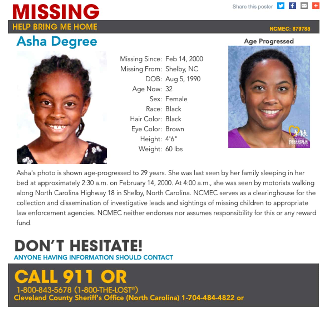 据她的家人说,阿莎是一个勤奋好学的9岁女孩,对陌生人都有着很高的警惕。但不知出于什么原因,她似乎在一个雨夜带着一个装有几件私人物品的书包,离开了她在北卡罗来纳州谢尔比的家。人们最后一次看到她走在大雾弥漫的高速公路上,是在2000年情人节的凌晨。