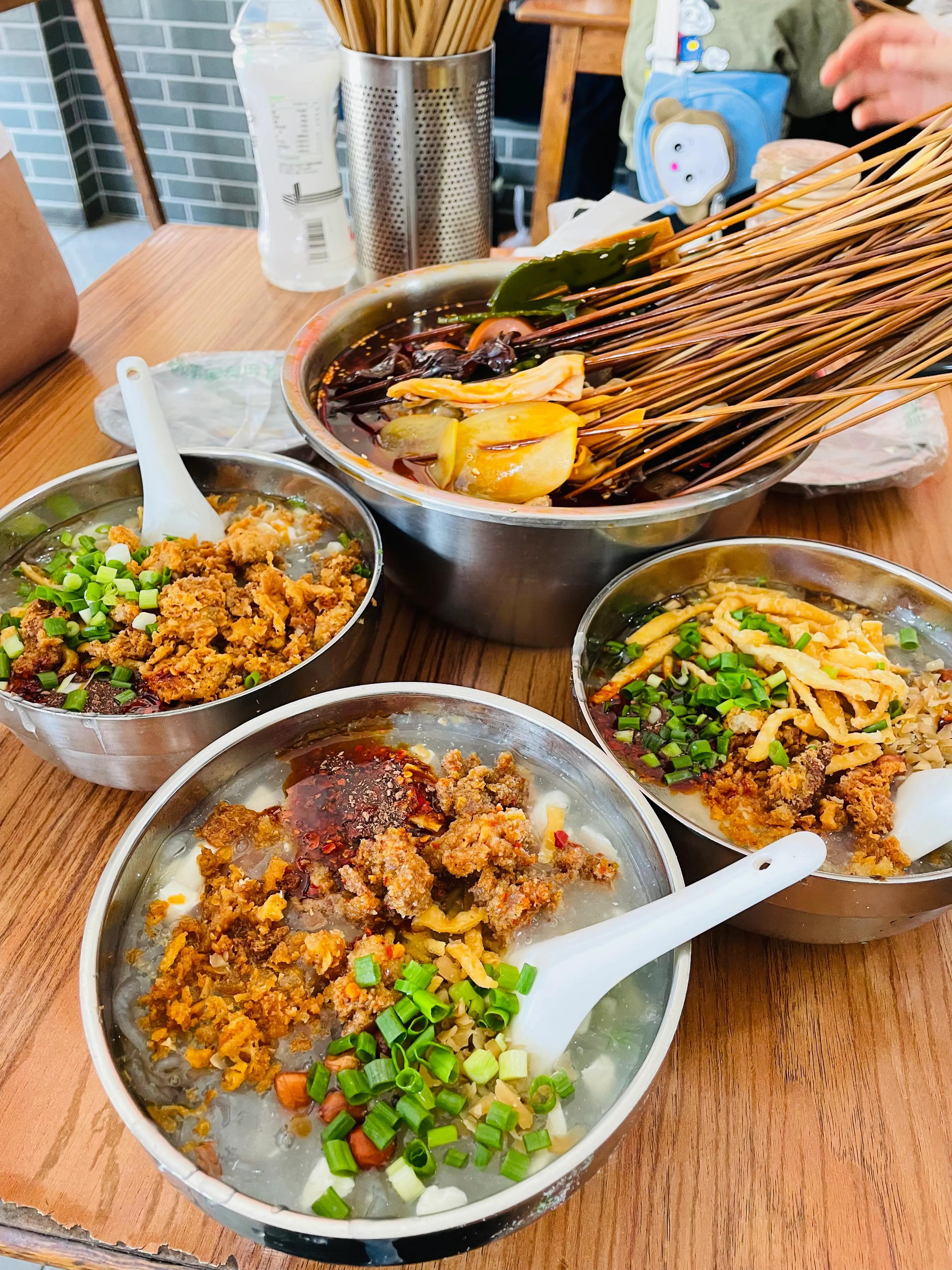 豆腐脑大约有十来种小菜及配料,相对而言老家的更显“寡淡”,但价格更加实惠;老家也流行吃钵钵鸡,更是藤椒味钵钵鸡的起源地,这里不作对比,各有特色。