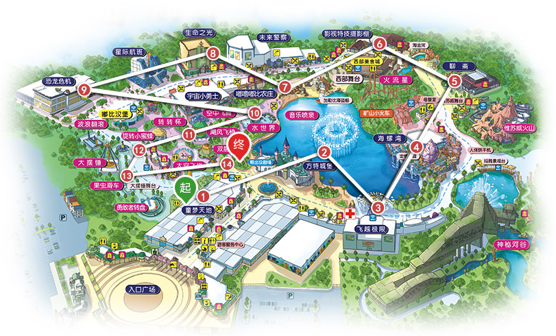 惊险之旅:(太空飞梭→勇敢者转盘→空中飞舞→飓风飞椅→大摆锤→恐龙危机→星际航班→宇宙小勇士→未来警察→火流星→维苏威火山→神秘河谷→飞越极限)