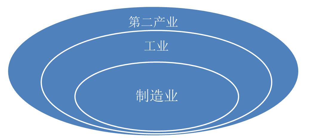 工业是对自然资源的开采、采集和对各种原材料进行加工的社会物质生产部门,从定义来看,工业包括B、C、D三大行业[2],加上建筑业(D)构成第二产业。于是,第二产业、工业、建筑业三者之间的关系如下图: