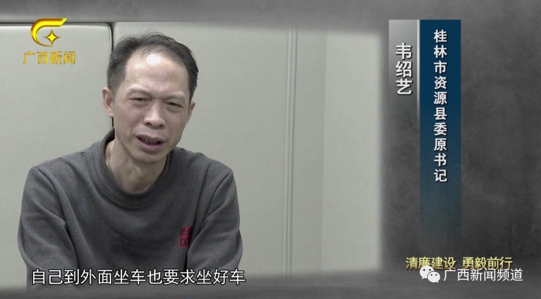 桂林市资源县委原书记 韦绍艺:自己心里都不平衡,也在自己思想中逐渐产生了,逐渐滋生了封建糜烂的东西、不健康的东西,自己也在追求工作之余,跟这些老板喝好茶、喝好酒、坐好车。自己到外面坐车也要求坐好车,坐动车要一等座。
